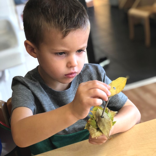 - Make a leaf kabab! Take a small dull stick and poke the leaves through. An adult can use a hole punch to create the hole (see photo). See how many leaves you can stack on a stick.